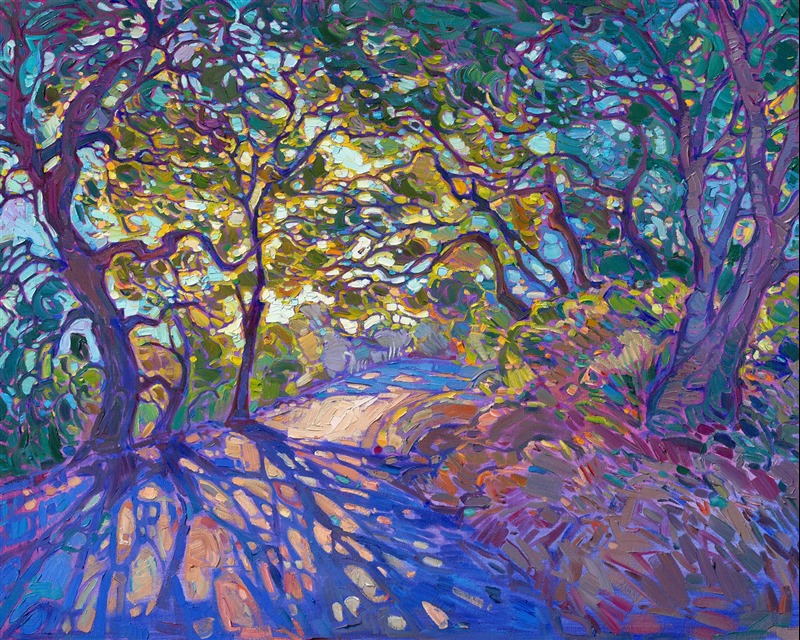 I love driving the winding roads through Paso Robles wine country. At the high elevations, I pass by sun-lit vineyards and open orchards, and when the roads dip down in the valleys, I pass beneath overhanging oak trees and hanging moss, and I can hear the sound of water trickling by in the nearby stream. This painting captures this view of Paso from between the oak trees, where crystalline light casts long shadows across the road.