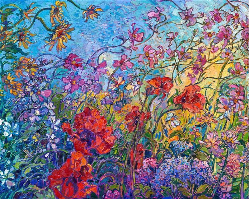 A wild flurry of garden flowers tumbles across the canvas, captured in time by the artist's brush. Impasto strokes of oil paint add texture and movement to the piece, while contrasting colors of blooms ignite the imagination and stir emotions.
