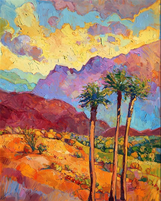 Bright springtime colors pop from the canvas in this painting of Indian Wells, near Palm Springs. This California desert painting captures the heat and color you see in the desert at sunset.