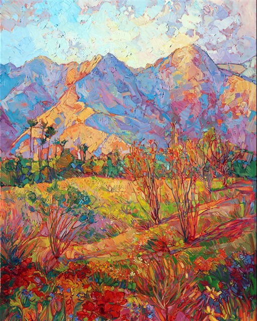 Note on varnishing: Erin’s paintings take six to eight weeks to dry, at which time we apply a retouching varnish, which allows the painting to complete the curing process while having a layer of protection against dirt and scuffs. The full curing process for an impasto oil painting takes at least two years. We are happy to assist in applying a final finishing varnish to your Erin Hanson oil painting once it has been dry for at least two years. Here is more information on how to care for your original oil painting.