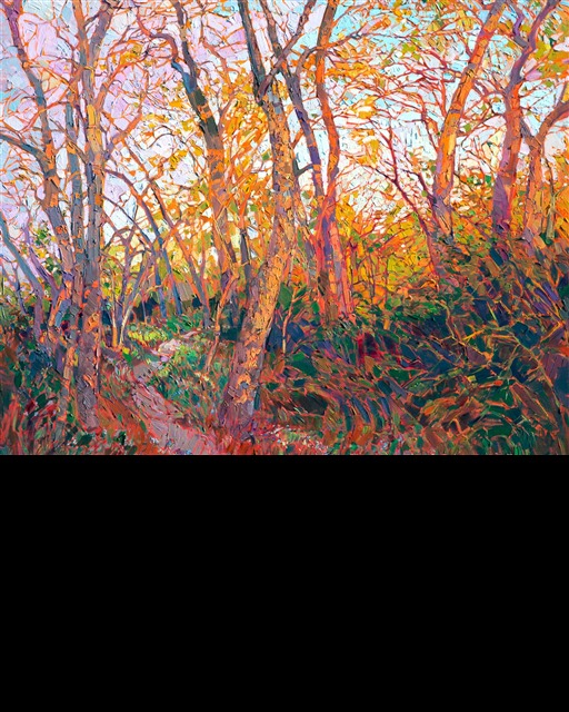 Beautiful flecks of color dance through the branches of these oaks, their overhanging branches forming a cool tunnel of shade protecting the hiking trail. The brush strokes are loose and full of texture, creating an expressionist movement of color and light.