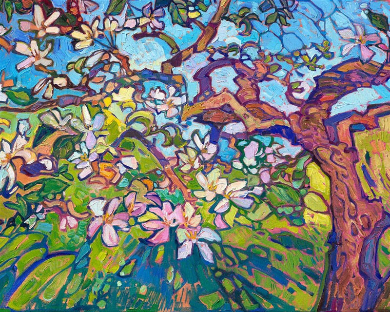 Style: "Open Impressionism" is a new style of painting developed by American artist Erin Hanson. The style is characterized by short, impasto brush strokes that are applied without layering, creating a mosaic or stained-glass appearance to the paintings. The paintings are created with a limited palette of colors, applied without blending or mixing upon the canvas, which adds a dimension of texture to each brush stroke. Inspired by classic impressionism, pointillism, and post-impressionism, Erin Hanson continues the tradition of impressionism into the modern day with her colorful and vivacious landscape paintings.