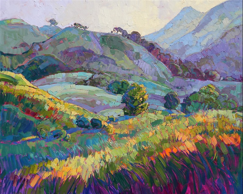 Style: "Open Impressionism" is a new style of painting developed by American artist Erin Hanson. The style is characterized by short, impasto brush strokes that are applied without layering, creating a mosaic or stained-glass appearance to the paintings. The paintings are created with a limited palette of colors, applied without blending or mixing upon the canvas, which adds a dimension of texture to each brush stroke. Inspired by classic impressionism, pointillism, and post-impressionism, Erin Hanson continues the tradition of impressionism into the modern day with her colorful and vivacious landscape paintings.