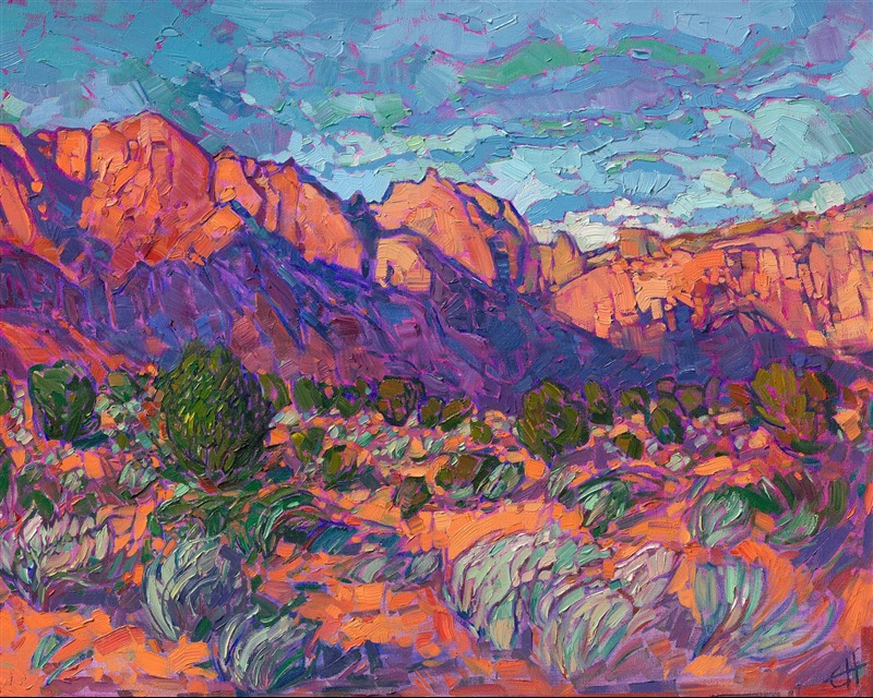 ERIN HANSON has been painting in oils since she was 8 years old. As a teenager, she apprenticed at a mural studio where she worked on 40-foot-long paintings while selling art commissions on the side. After being told it was too hard to make a living as an artist, she got her degree in Bioengineering from UC Berkeley. Afterward, Erin became a rock climber at Red Rock Canyon, Nevada. Inspired by the colorful scenery she was climbing, she decided to return to her love of painting and create one new painting every week.