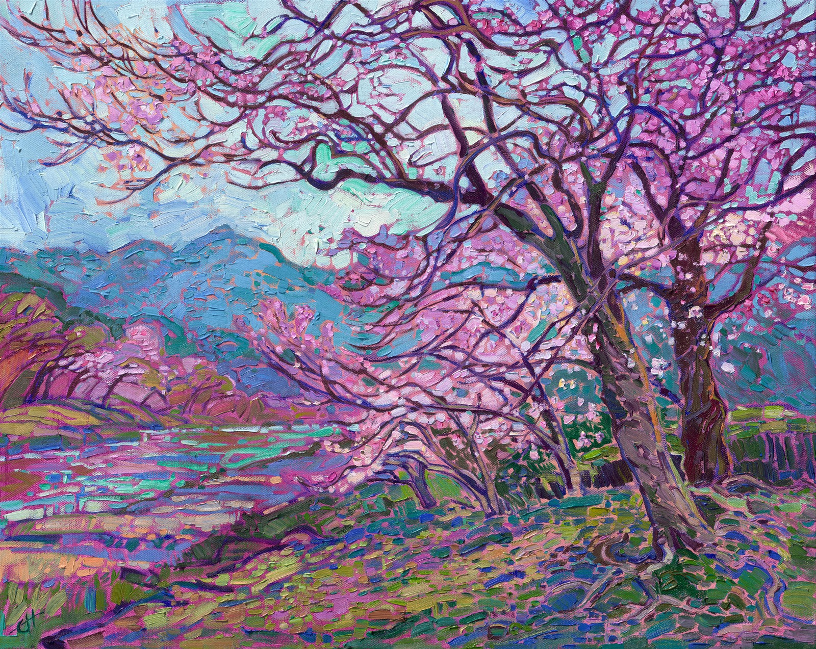 Kyoto, Japan, is one of the most beautiful locations to see cherry trees in full bloom. This piece captures the cherry trees that grow along a riverbed in Kyoto. The Yoshino cherry tree's artistic branches and delicate pink and white blooms are a joy to paint. This Japanese cherry blossom painting is available for purchase by master impressionist Erin Hanson. Canvas prints and 3D Textured Replicas are also available in various sizes and framing options.