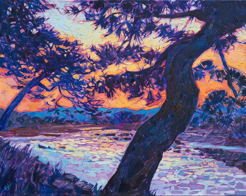 Note on varnishing: Erin’s paintings take six to eight weeks to dry, at which time we apply a retouching varnish, which allows the painting to complete the curing process while having a layer of protection against dirt and scuffs. The full curing process for an impasto oil painting takes at least two years. We are happy to assist in applying a final finishing varnish to your Erin Hanson oil painting once it has been dry for at least two years. Here is more information on how to care for your original oil painting.