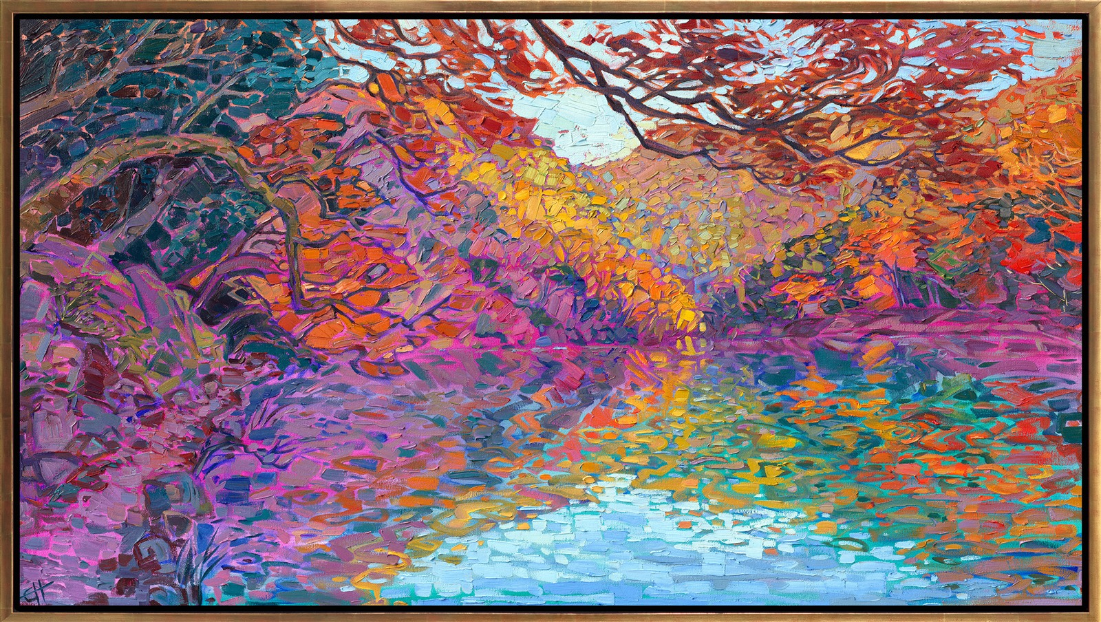 "Kyoto Reflections" is an original oil painting by Erin Hanson, painted on stretched canvas and framed in a contemporary gold floater frame.