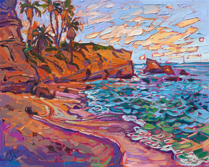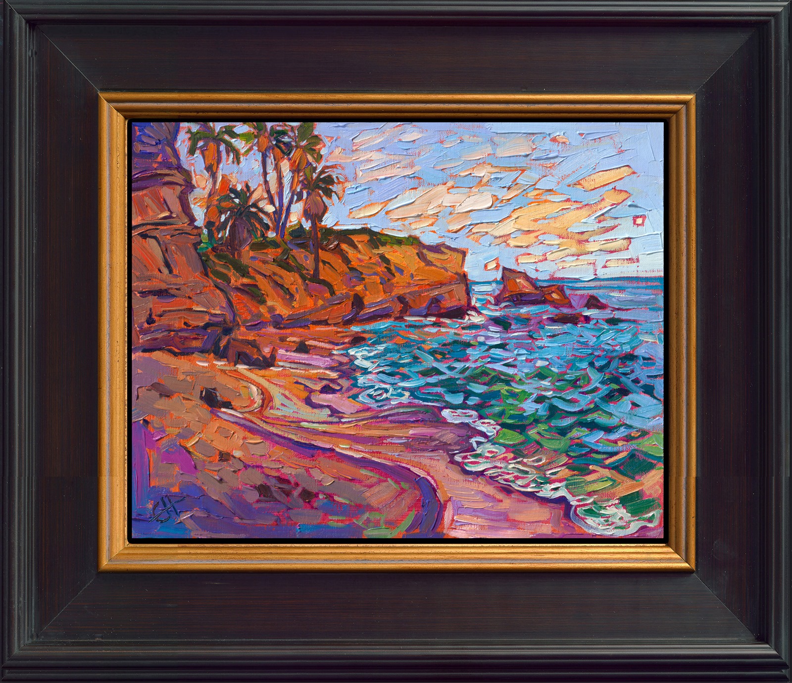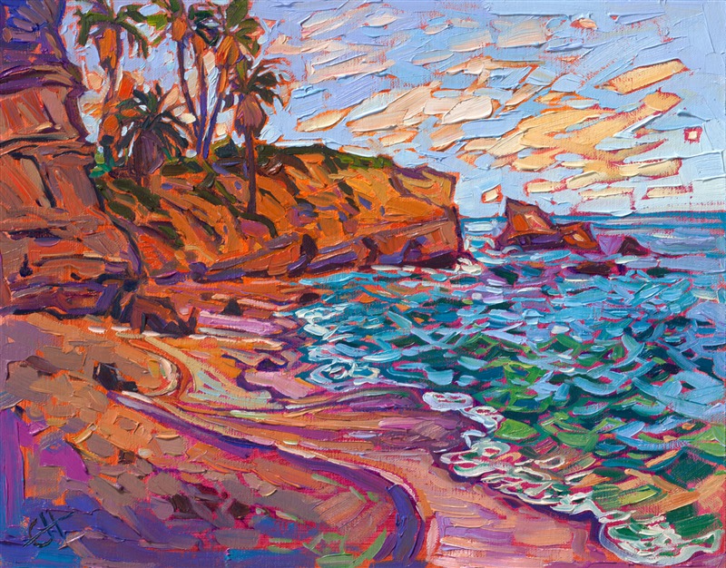 Note on varnishing: Erin’s paintings take six to eight weeks to dry, at which time we apply a retouching varnish, which allows the painting to complete the curing process while having a layer of protection against dirt and scuffs. The full curing process for an impasto oil painting takes at least two years. We are happy to assist in applying a final finishing varnish to your Erin Hanson oil painting once it has been dry for at least two years. Here is more information on how to care for your original oil painting.
