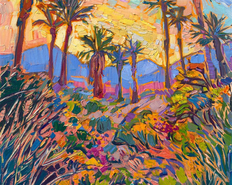 La Quinta, in the high desert of California, is beautiful in the springtime, when desert wildflowers and cultivated blooms both are in full color. This painting captures a view from the foothills looking down over layers of blooms and palm trees. Thick, impressionistic brush strokes capture the fleeting light of sunrise.