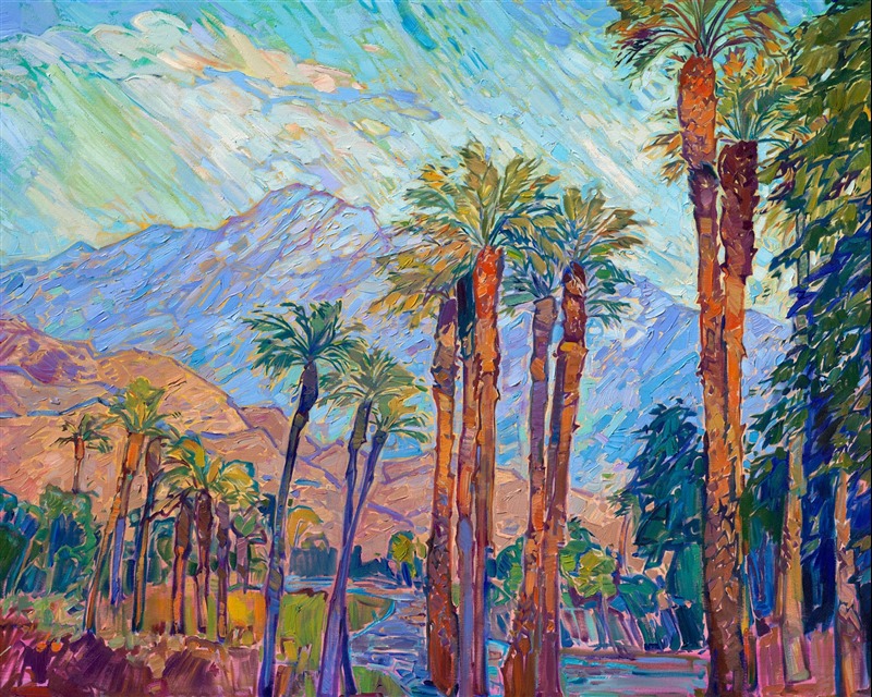 Note on varnishing: Erin’s paintings take six to eight weeks to dry, at which time we apply a retouching varnish, which allows the painting to complete the curing process while having a layer of protection against dirt and scuffs. The full curing process for an impasto oil painting takes at least two years. We are happy to assist in applying a final finishing varnish to your Erin Hanson oil painting once it has been dry for at least two years. Here is more information on how to care for your original oil painting.