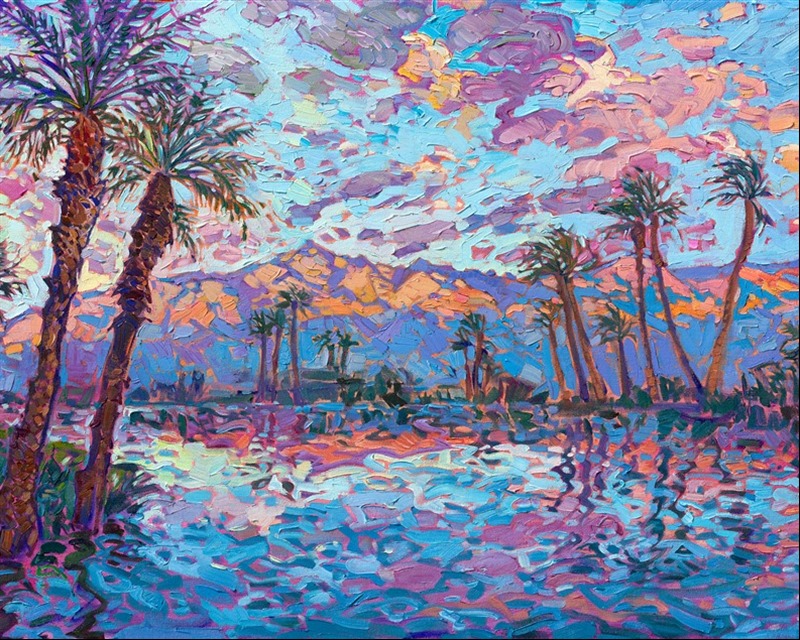 I love painting palm tree reflections in one of the many man-made lakes in La Quinta, California. The sherbet-colored desert mountains, lanky palm trees, and sunset reflections all capture the beauty of the California desert. Expressive strokes of thickly applied oil paint communicate the movement and wind of the high desert. This painting was created in Erin Hanson's signature Open Impressionism style.