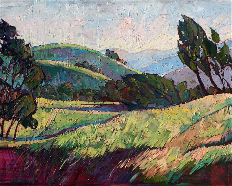 Style: "Open Impressionism" is a new style of painting developed by American artist Erin Hanson. The style is characterized by short, impasto brush strokes that are applied without layering, creating a mosaic or stained-glass appearance to the paintings. The paintings are created with a limited palette of colors, applied without blending or mixing upon the canvas, which adds a dimension of texture to each brush stroke. Inspired by classic impressionism, pointillism, and post-impressionism, Erin Hanson continues the tradition of impressionism into the modern day with her colorful and vivacious landscape paintings.