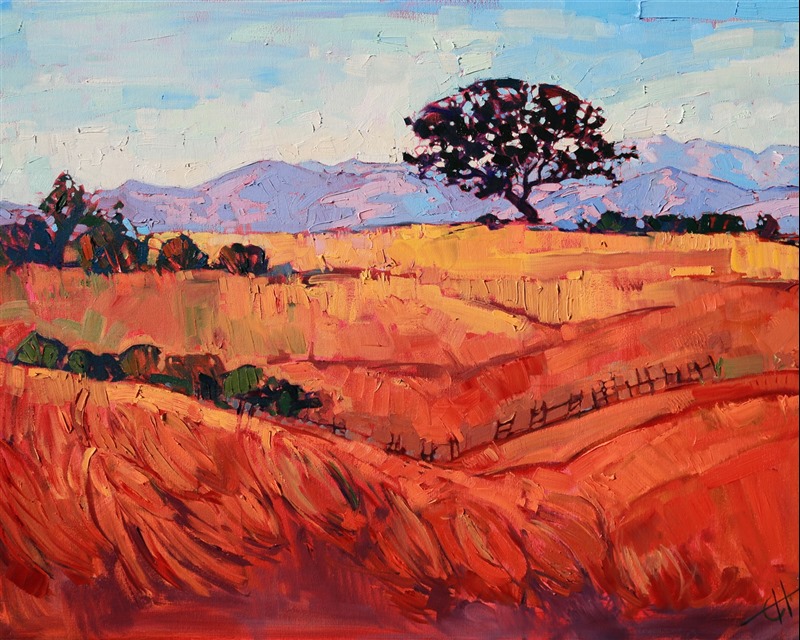 Layers of summer colors in red and gold grace the hillsides of east Paso Robles. The distant mountains seem cool and restful in the distant atmosphere. This painting was created with bold, impasto brush strokes that capture the spontaneous feeling of the wide outdoors.