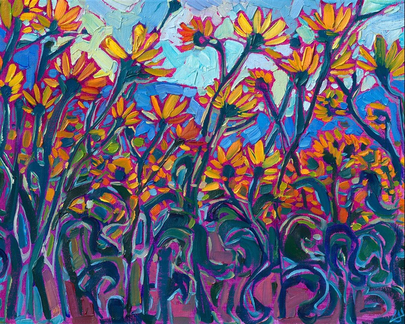 Erin devoted three years to perfecting the technology of 3D art printing in a quest to create a fine art print that captured her vibrant colors and reproduced the texture crucial to her artistic vision. The rhythms of texture in her luscious, impasto oil paintings communicate the movement and joy she finds in nature.