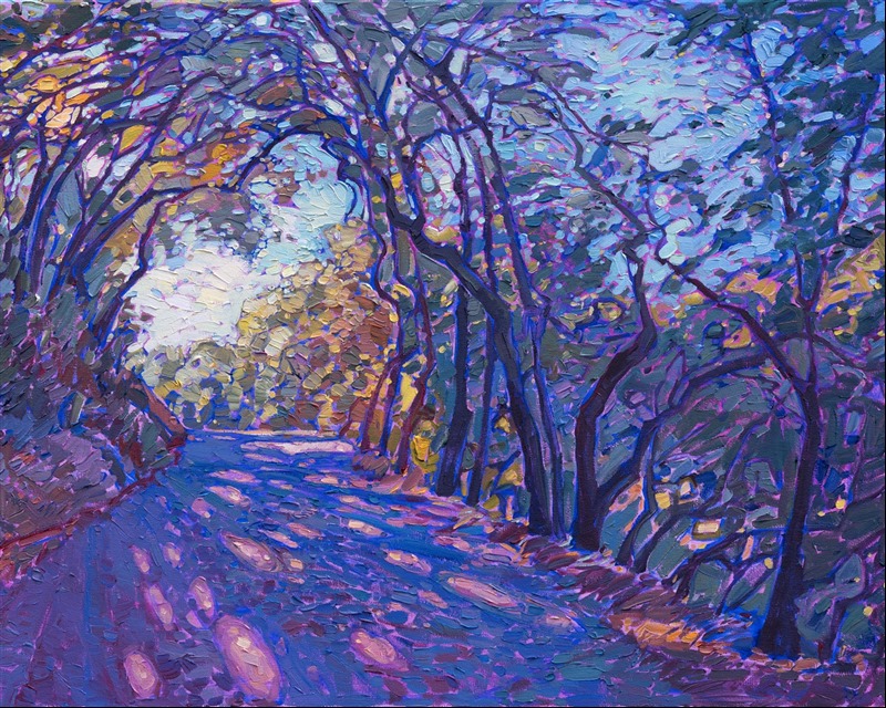 Style: "Open Impressionism" is a new style of painting developed by American artist Erin Hanson. The style is characterized by short, impasto brush strokes that are applied without layering, creating a mosaic or stained-glass appearance to the paintings. The paintings are created with a limited palette of colors, applied without blending or mixing upon the canvas, which adds a dimension of texture to each brush stroke. Inspired by classic impressionism, pointillism, and post-impressionism, Erin Hanson continues the tradition of impressionism into the modern day with her colorful and vivacious landscape paintings.