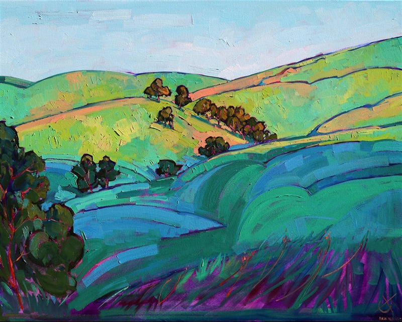 Style: "Open Impressionism" is a new style of painting developed by American artist Erin Hanson. The style is characterized by short, impasto brush strokes that are applied without layering, creating a mosaic or stained-glass appearance to the paintings. The paintings are created with a limited palette of colors, applied without blending or mixing upon the canvas, which adds a dimension of texture to each brush stroke. Inspired by classic impressionism, pointillism, and post-impressionism, Erin Hanson continues the tradition of impressionism into the modern day with her colorful and vivacious landscape paintings.