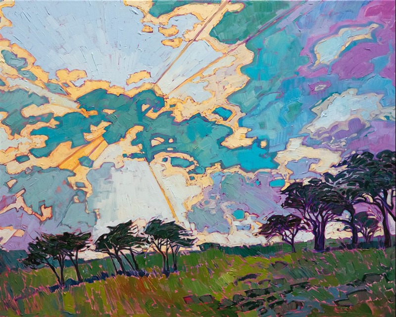Note on varnishing: Erin’s paintings take six to eight weeks to dry, at which time we apply a retouching varnish, which allows the painting to complete the curing process while having a layer of protection against dirt and scuffs. The full curing process for an impasto oil painting takes at least two years. We are happy to assist in applying a final finishing varnish to your Erin Hanson oil painting once it has been dry for at least two years. Here is more information on how to care for your original oil painting.