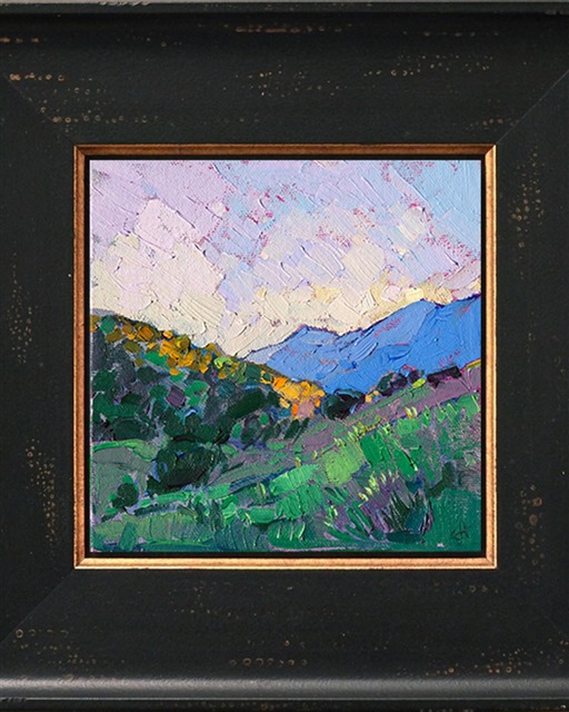 Note on varnishing: Erin’s paintings take six to eight weeks to dry, at which time we apply a retouching varnish, which allows the painting to complete the curing process while having a layer of protection against dirt and scuffs. The full curing process for an impasto oil painting takes at least two years. We are happy to assist in applying a final finishing varnish to your Erin Hanson oil painting once it has been dry for at least two years. Here is more information on how to care for your original oil painting.