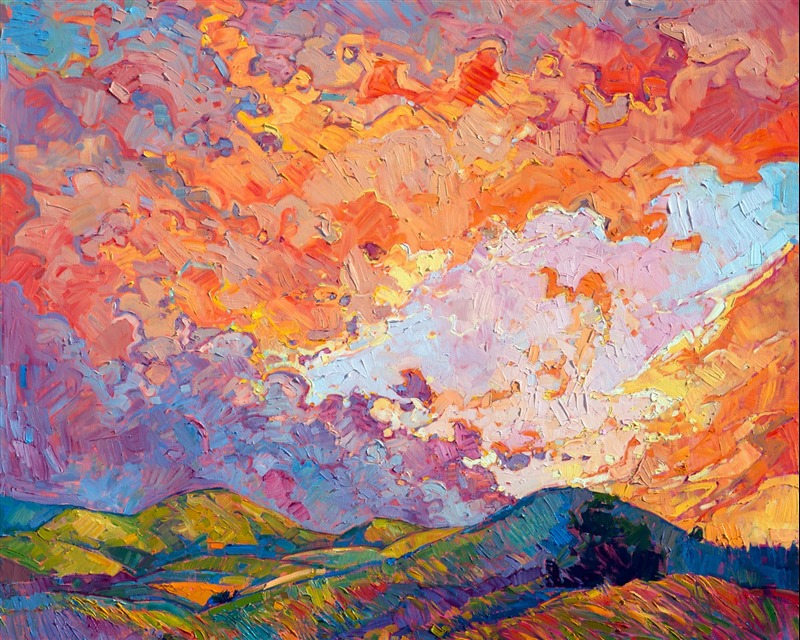 Style: "Open Impressionism" is a new style of painting developed by American artist Erin Hanson. The style is characterized by short, impasto brush strokes that are applied without layering, creating a mosaic or stained-glass appearance to the paintings. The paintings are created with a limited palette of colors, applied without blending or mixing upon the canvas, which adds a dimension of texture to each brush stroke. Inspired by classic impressionism, pointillism, and post-impressionism, Erin Hanson continues the tradition of impressionism into the modern day with her colorful and vivacious landscape paintings.