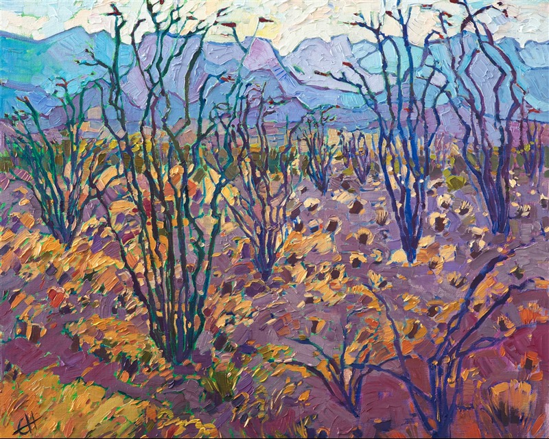 This is the first painting I have done of Big Bend National Park. I visited Big Bend in the spring and was amazed by the multitude of ocotillo and beautiful spring colors. My favorite part of the park was the abstract shapes of jagged buttes rising dramatically above the desert floor.