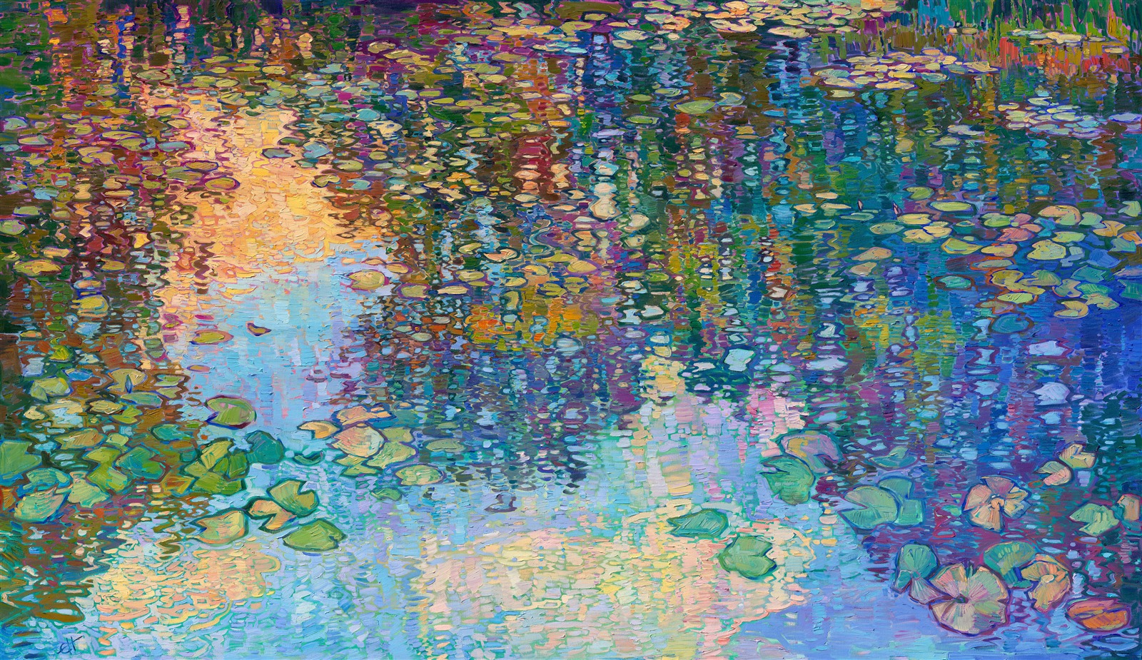 Note on varnishing: Erin’s paintings take six to eight weeks to dry, at which time we apply a retouching varnish, which allows the painting to complete the curing process while having a layer of protection against dirt and scuffs. The full curing process for an impasto oil painting takes at least two years. We are happy to assist in applying a final finishing varnish to your Erin Hanson oil painting once it has been dry for at least two years. Here is more information on how to care for your original oil painting.