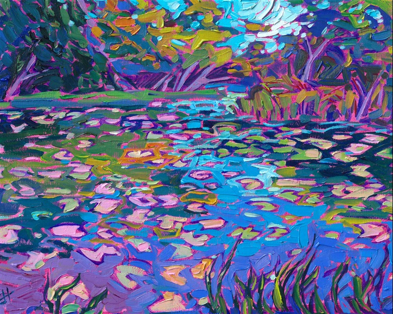 "Lily Reflections" was created on linen board, and the petite oil painting arrives framed in a gold plein air frame.