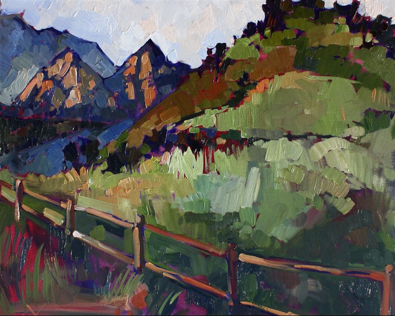 Style: "Open Impressionism" is a new style of painting developed by American artist Erin Hanson. The style is characterized by short, impasto brush strokes that are applied without layering, creating a mosaic or stained-glass appearance to the paintings. The paintings are created with a limited palette of colors, applied without blending or mixing upon the canvas, which adds a dimension of texture to each brush stroke. Inspired by classic impressionism, pointillism, and post-impressionism, Erin Hanson continues the tradition of impressionism into the modern day with her colorful and vivacious landscape paintings.