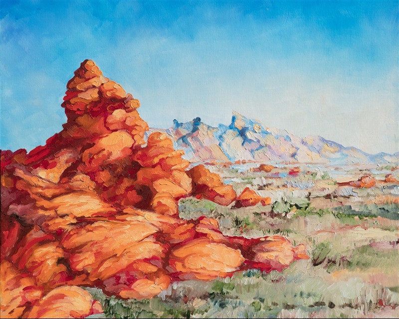 People always see faces and animals in the red rock formations of Valley of Fire State Park. The artist had already finished the painting before she saw the clear outlines of the Man in the Mountain in her work.