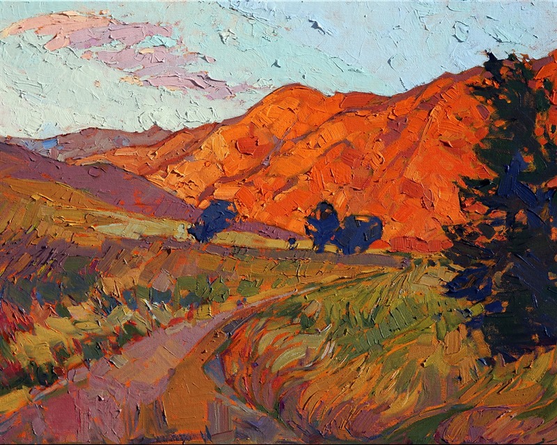 Mandarin-orange light is reflected off these layers of hills, a bold contrast against the smaller oaks and fir trees. This idyllic country painting captures one of those fleeting moments of peaceful beauty that lasts only a minute during a beautiful sunset. Thick brush strokes of oil paint create a mosaic of color and texture within the painting.
