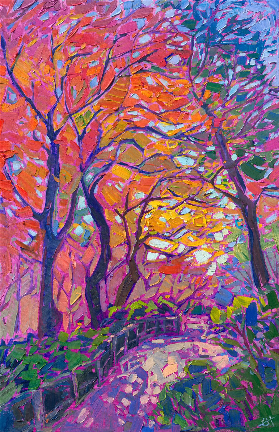 Note on varnishing: Erin’s paintings take six to eight weeks to dry, at which time we apply a retouching varnish, which allows the painting to complete the curing process while having a layer of protection against dirt and scuffs. The full curing process for an impasto oil painting takes at least two years. We are happy to assist in applying a final finishing varnish to your Erin Hanson oil painting once it has been dry for at least two years. Here is more information on how to care for your original oil painting.