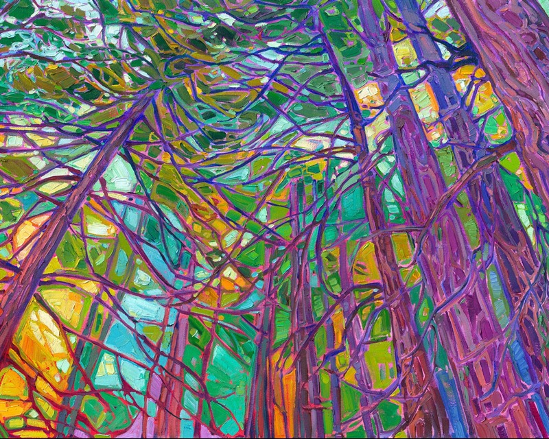 "Mendocino Redwoods" is an original oil painting done in Erin Hanson's contemporary impressionism style, known as Open Impressionism. The brush strokes are laid side by side, without layering, creating a stained glass or mosaic look to the painting. The piece arrives framed in a gold floater frame, ready to hang.