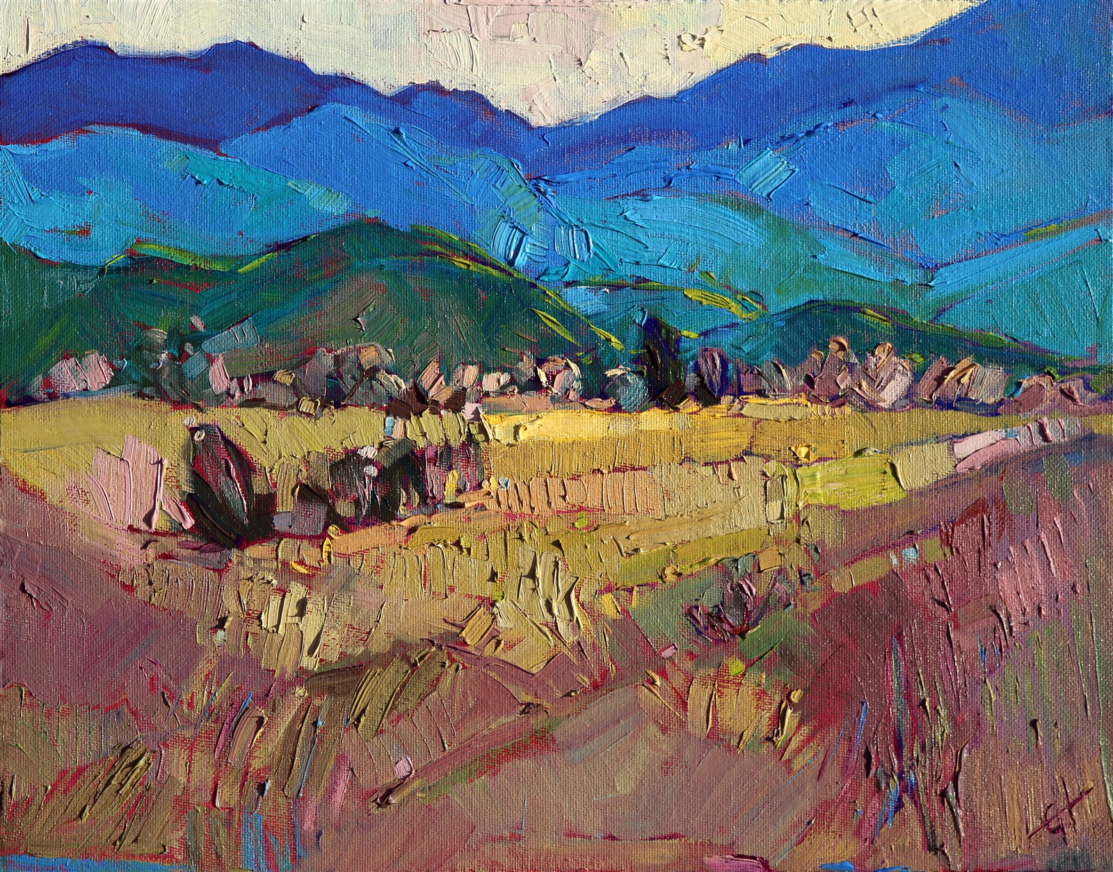 Style: "Open Impressionism" is a new style of painting developed by American artist Erin Hanson. The style is characterized by short, impasto brush strokes that are applied without layering, creating a mosaic or stained-glass appearance to the paintings. The paintings are created with a limited palette of colors, applied without blending or mixing upon the canvas, which adds a dimension of texture to each brush stroke. Inspired by classic impressionism, pointillism, and post-impressionism, Erin Hanson continues the tradition of impressionism into the modern day with her colorful and vivacious landscape paintings.