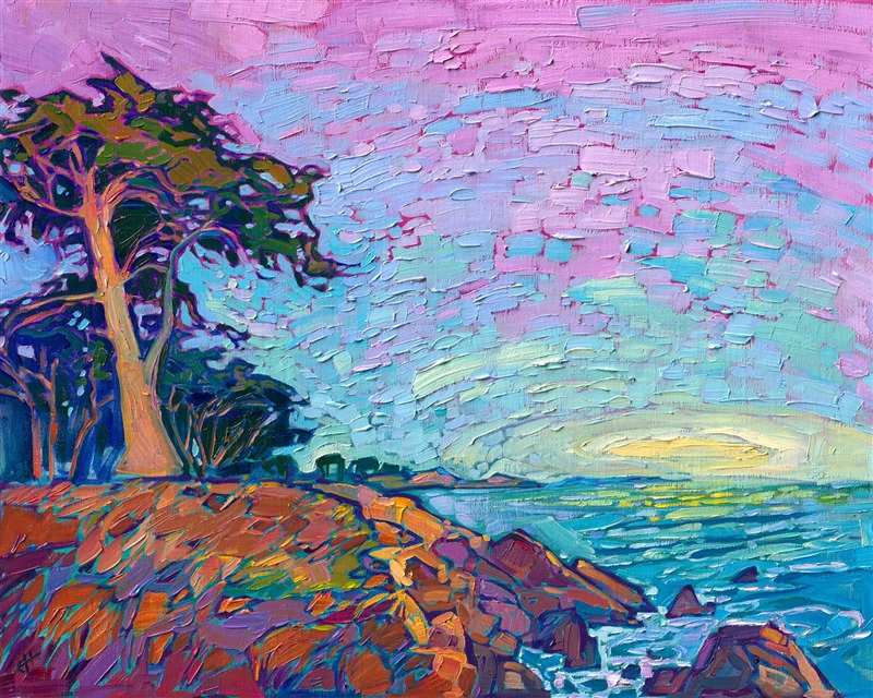 Pacific Grove is most beautiful just before dusk when the entire landscape lights up with hues of pink and orange. This impressionistic painting captures the beauty of the Monterey Peninsula with broad brush strokes.
