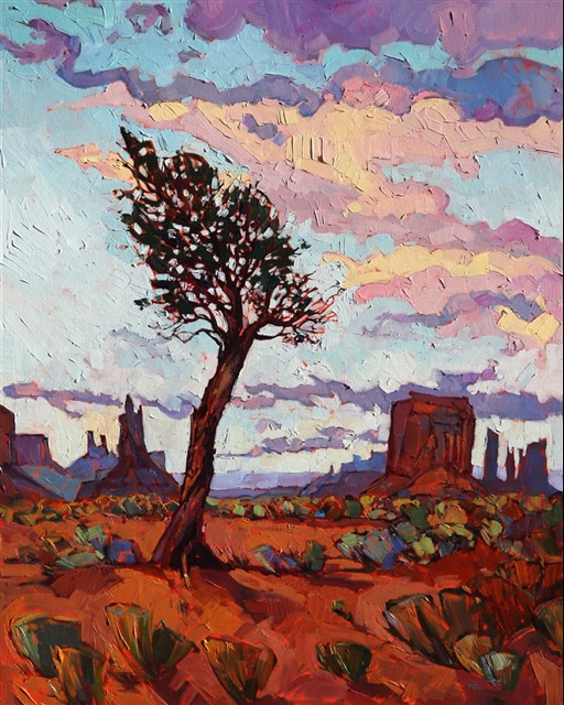 Monument Valley is the perfect place to inspire dramatic paintings, with its wide colorful skies and multitude of beautiful red and purple buttes. This oil painting uses wide brush strokes and lots of texture to communicate the movement and life of this Utah landscape.
