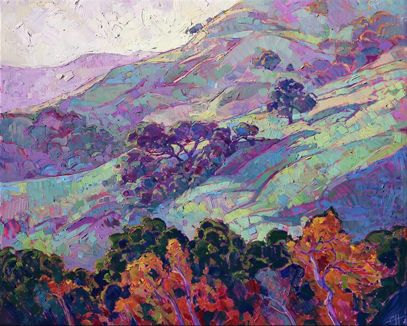 Style: "Open Impressionism" is a new style of painting developed by American artist Erin Hanson. The style is characterized by short, impasto brush strokes that are applied without layering, creating a mosaic or stained-glass appearance to the paintings. The paintings are created with a limited palette of colors, applied without blending or mixing upon the canvas, which adds a dimension of texture to each brush stroke. Inspired by classic impressionism, pointillism, and post-impressionism, Erin Hanson continues the tradition of impressionism into the modern day with her colorful and vivacious landscape paintings.