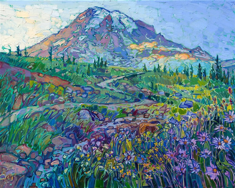 The trail to the summit of Mt Rainier is one of the most beautiful hikes I've ever done. Lush grasses and abundant wildflowers blanket the landscape in greens and pops of color. The peak of Mt Rainier looms above, larger than I can possibly capture on a canvas, golden clouds of fog clinging to the sides of the mountain. I used thick brush strokes of oil paint laid side-by-side on the canvas to capture the strong shapes and texture of the mountain. Delicate blooms in lavender, white, and yellow set off the foreground.