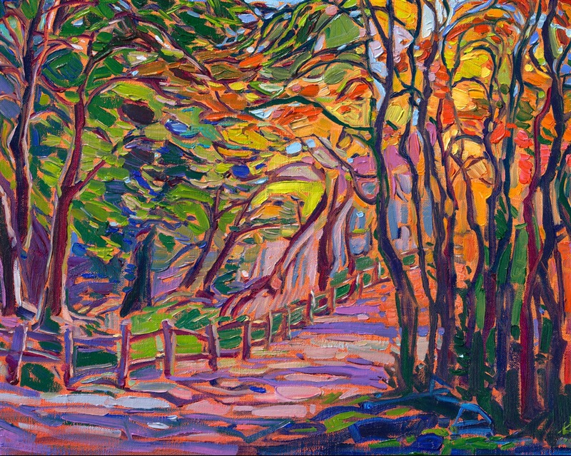 Style: "Open Impressionism" is a new style of painting developed by American artist Erin Hanson. The style is characterized by short, impasto brush strokes that are applied without layering, creating a mosaic or stained-glass appearance to the paintings. The paintings are created with a limited palette of colors, applied without blending or mixing upon the canvas, which adds a dimension of texture to each brush stroke. Inspired by classic impressionism, pointillism, and post-impressionism, Erin Hanson continues the tradition of impressionism into the modern day with her colorful and vivacious landscape paintings.