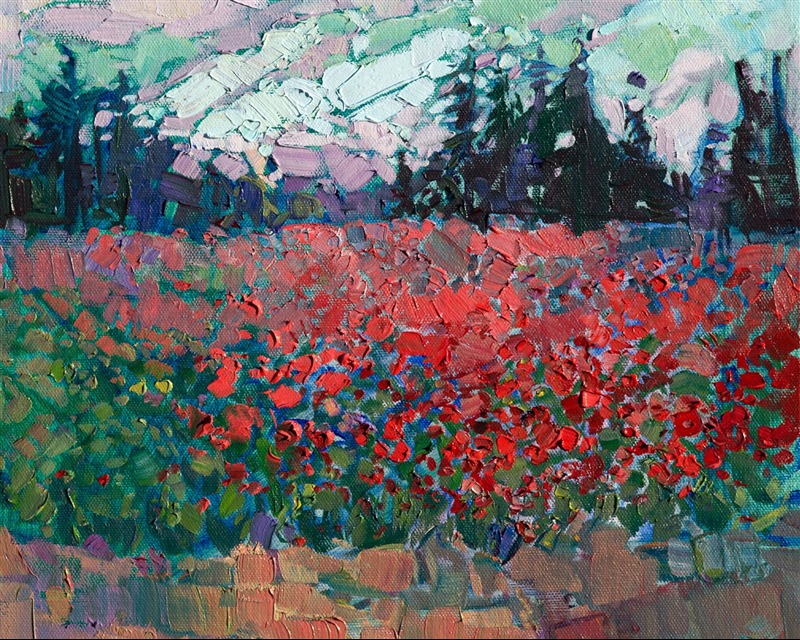 Note on varnishing: Erin’s paintings take six to eight weeks to dry, at which time we apply a retouching varnish, which allows the painting to complete the curing process while having a layer of protection against dirt and scuffs. The full curing process for an impasto oil painting takes at least two years. We are happy to assist in applying a final finishing varnish to your Erin Hanson oil painting once it has been dry for at least two years. Here is more information on how to care for your original oil painting.
