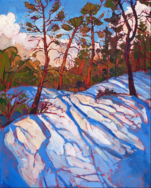 Erin Hanson's canvas prints have the illusion of texture, and they accurately reproduce the brilliant colors of Erin's originals. Canvas prints are printed directly onto canvas rolls using our state-of-the-art Epsom printer. These prints do not have texture applied -- they are flat prints, but they accurately capture the illusion of texture because of the shadows cast by the paint ridges during photography. The canvas prints come rolled, stretched, or framed and ready to hang.