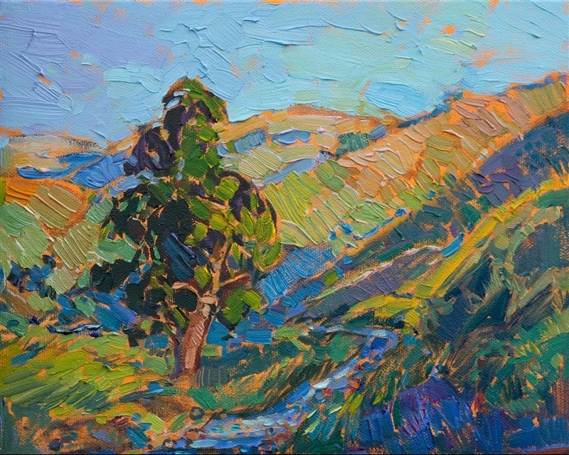 ERIN HANSON has been painting in oils since she was 8 years old. As a teenager, she apprenticed at a mural studio where she worked on 40-foot-long paintings while selling art commissions on the side. After being told it was too hard to make a living as an artist, she got her degree in Bioengineering from UC Berkeley. Afterward, Erin became a rock climber at Red Rock Canyon, Nevada. Inspired by the colorful scenery she was climbing, she decided to return to her love of painting and create one new painting every week.