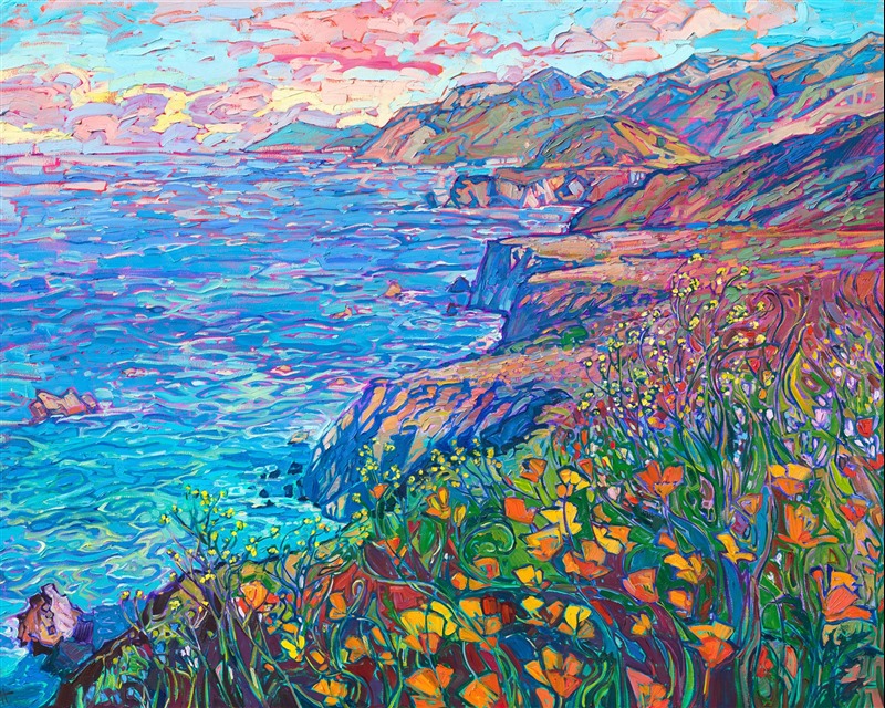 Blooming wildflowers grow in abundance along Highway 1. The glorious variety of color sparkles in the sunlight, a beautiful contrast to the blue and turquoise ocean waters below. Thick, impressionistic brush strokes capture all the lavish colors of California.