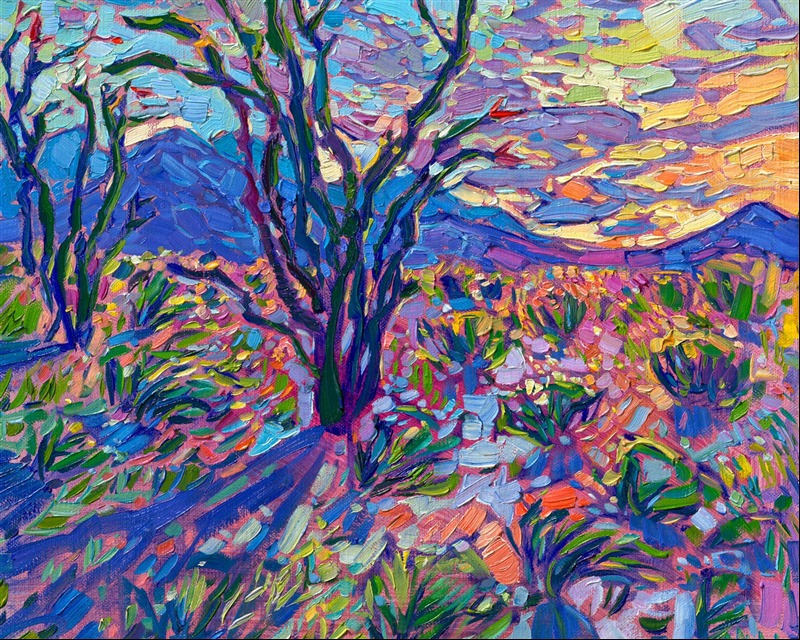 Style: "Open Impressionism" is a new style of painting developed by American artist Erin Hanson. The style is characterized by short, impasto brush strokes that are applied without layering, creating a mosaic or stained-glass appearance to the paintings. The paintings are created with a limited palette of colors, applied without blending or mixing upon the canvas, which adds a dimension of texture to each brush stroke. Inspired by classic impressionism, pointillism, and post-impressionism, Erin Hanson continues the tradition of impressionism into the modern day with her colorful and vivacious landscape paintings.