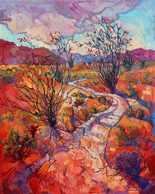 Style: "Open Impressionism" is a new style of painting developed by American artist Erin Hanson. The style is characterized by short, impasto brush strokes that are applied without layering, creating a mosaic or stained-glass appearance to the paintings. The paintings are created with a limited palette of colors, applied without blending or mixing upon the canvas, which adds a dimension of texture to each brush stroke. Inspired by classic impressionism, pointillism, and post-impressionism, Erin Hanson continues the tradition of impressionism into the modern day with her colorful and vivacious landscape paintings.