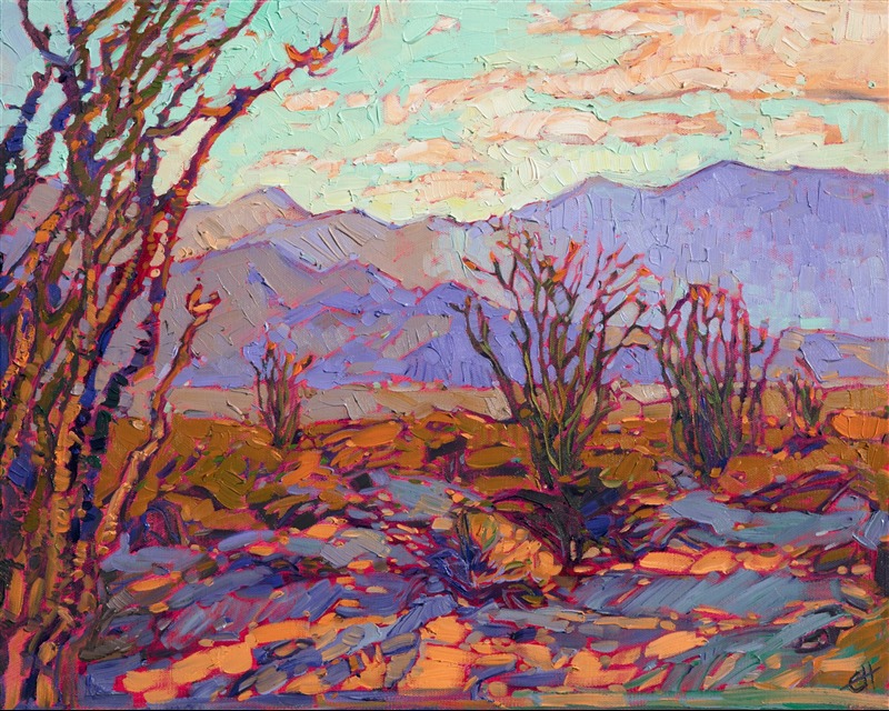 Autumn-colored ocotillo cacti decorate the high desert floor of Borrego Springs, California. This idyllic desert destination has wonderful hiking and exploring opportunities. I love painting the colorful scenery and dramatic backdrop of purple mountains that surround the valley.