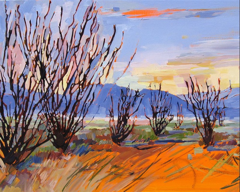 Hot cadmium orange burns through the sand in this oil painting of Joshua Tree National Park.