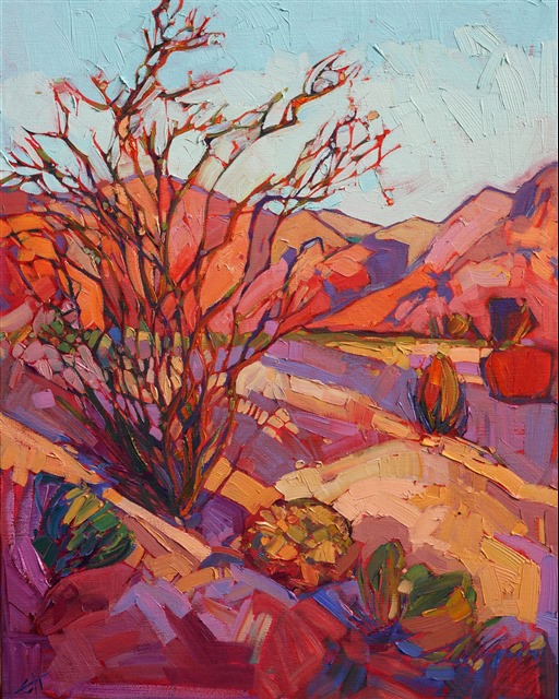 Beautiful and subtle color changes move across this California desert landscape. The abstract shapes of the landscape are dramatized in contrasting colors and brush strokes.