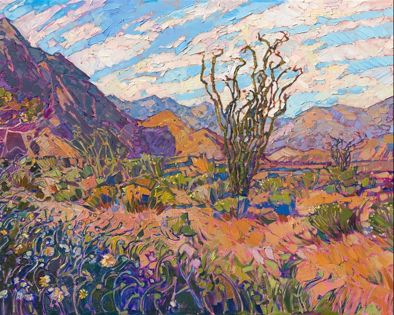 An explosion of color, this painting captures the desert superbloom in Borrego Springs. The brush strokes are loose and lively, bringing to life the movement and freedom of the wide outdoors. The original work on stretched canvas arrives framed in a gold floater frame.