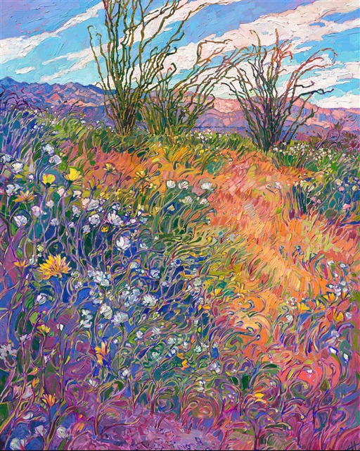 The 2017 super bloom became famous around the world for the gorgeous and abundant desert blooms that spread across the California desert. Visitors flocked to the tiny town of Borrego Springs in droves, hoping to photograph the unusual bounty. This painting captures the super bloom with vivid colors and loose, impressionistic brush strokes.