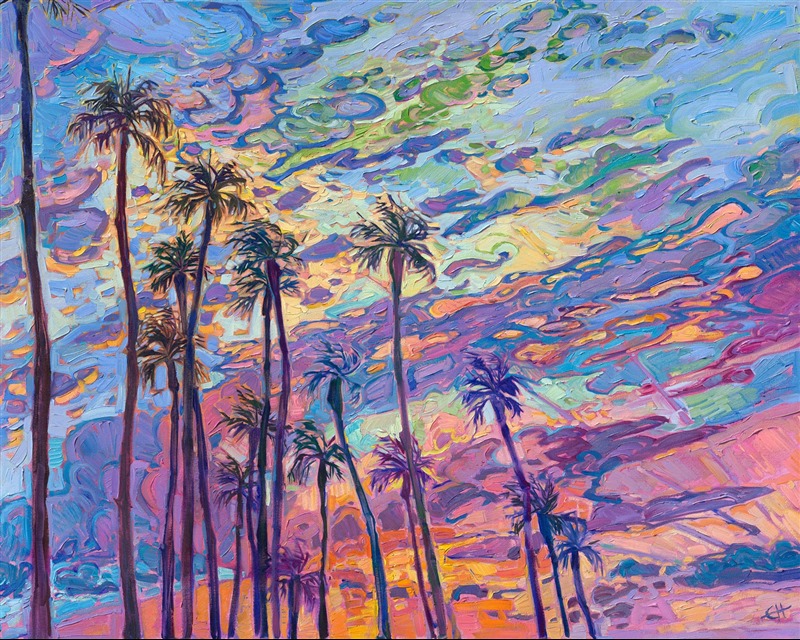 Note on varnishing: Erin’s paintings take six to eight weeks to dry, at which time we apply a retouching varnish, which allows the painting to complete the curing process while having a layer of protection against dirt and scuffs. The full curing process for an impasto oil painting takes at least two years. We are happy to assist in applying a final finishing varnish to your Erin Hanson oil painting once it has been dry for at least two years. Here is more information on how to care for your original oil painting.