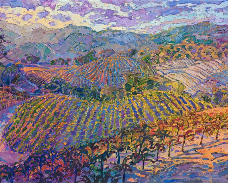 Opolo Vineyards in Paso Robles, California, is captured in kaleidoscope color in this impressionistic oil painting by Erin Hanson. The thick, expressive brush strokes and vivid hues capture the beauty and movement of the transient light across wine country at dawn.